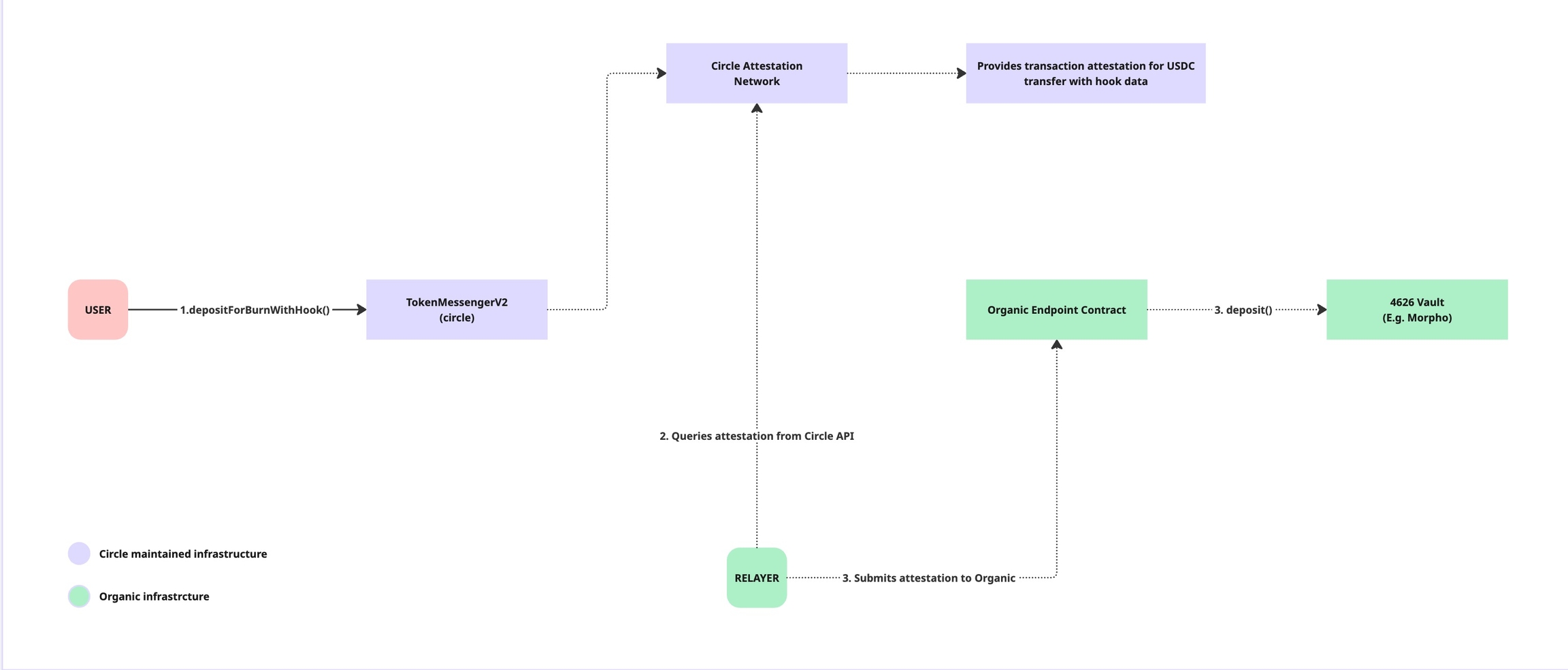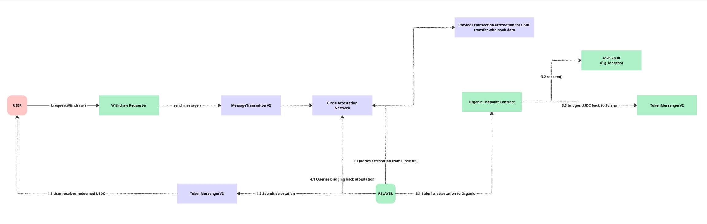 A relayer will submit the attestation to the Endpoint contract, which will withdraw the funds from the vault and send the USDC back to the user's wallet on Solana.